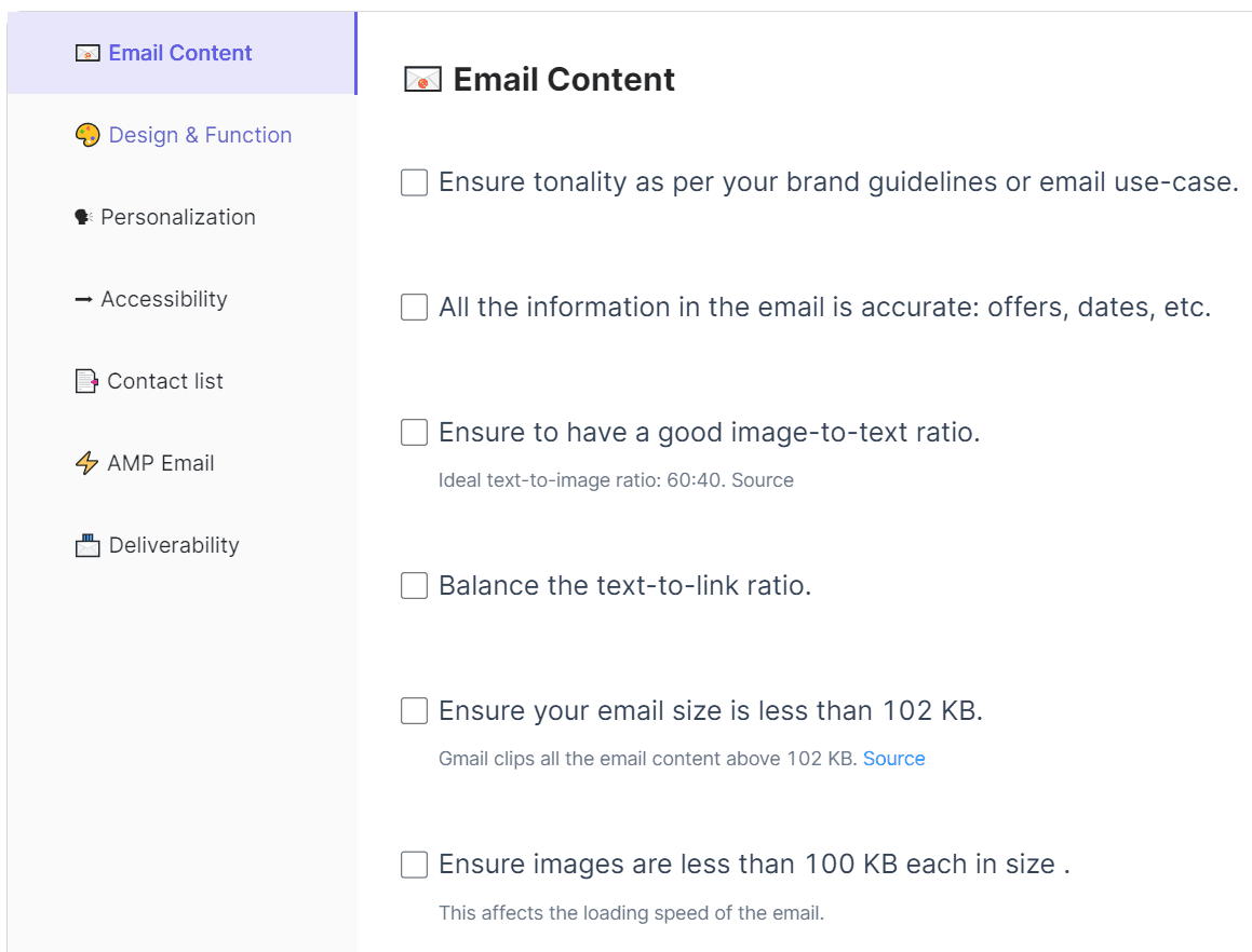 Check your email campaigns using our detailed Email QA checklist before sending them out. No more cold feet while hitting the 'Send' button!