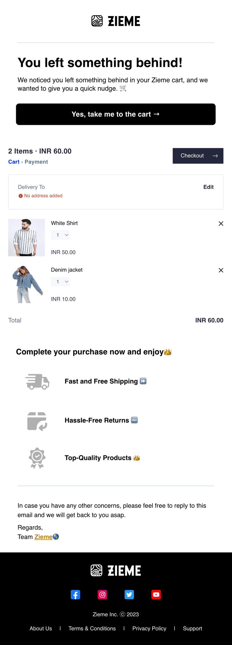 Recover abandoned carts with this engaging interactive cart recovery email template. Customize it by clicking on the button below.