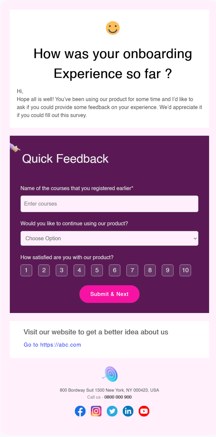 You can use these surveys during different lifecycle stages of a customer. You don't have to start from scratch to create an engaging and compelling survey that gets you a higher response. Use Mailmodo's interactive CSAT onboarding survey template and customize it per your requirement.