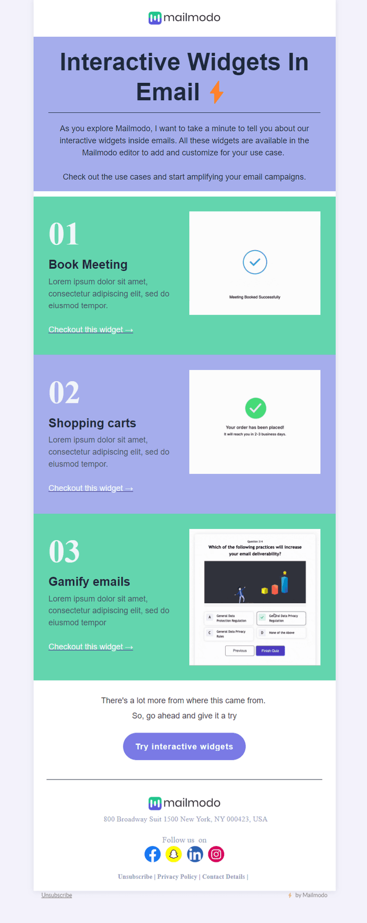 In the email template builder, you can try different email layouts, add or remove content blocks and blocks, and interactive widgets such as polls, spin the wheel, carousels, etc.