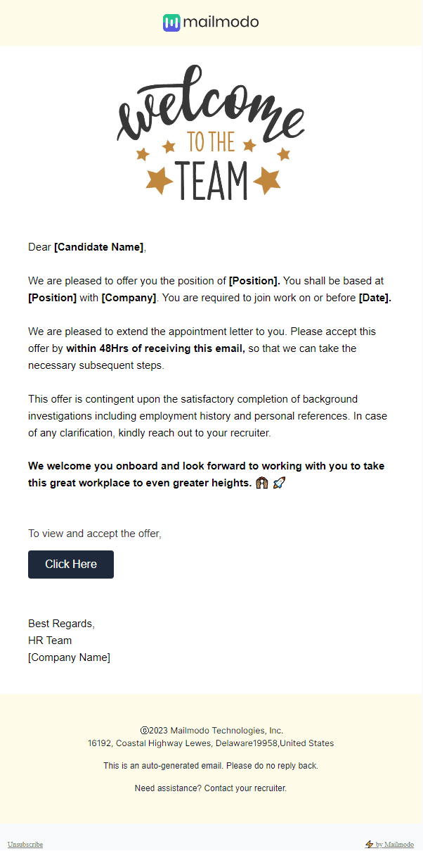 We know that hiring new employees is a challenging task that requires time and patience. That's why Mailmodo wants to help you make the best first impression possible by offering you this versatile interview invitation template that will speed up your hiring process.