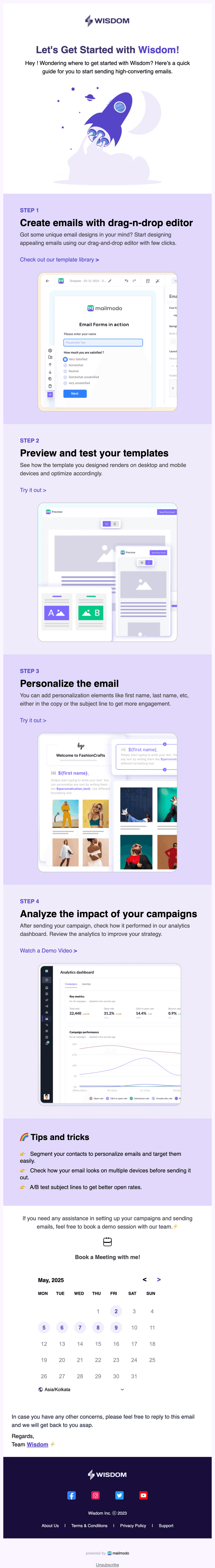 Putting your best foot forward with the sign-up email helps you build better customer relationships and turn them into brand loyalists. It's important to inform the customers what they can expect on signing up with you, provide more information about your brand to get them to trust you, and deliver on your promises. Our sign-up email template lets your customers fill and submit the sign up form inside the email without any redirects, thus reducing churn. You can also personalize the CTA by customizing our template to make your email more relevant.